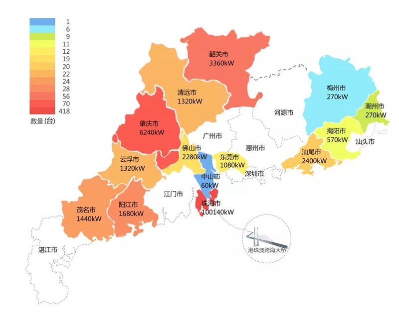 2018年,在港珠澳大桥充电桩项目中,东莞市铭杨机械有限公司在港珠澳大桥珠海端口岸人工岛搭建的充电管理平台及电能量采集终端,为大桥的绿色运营和电力保障提供技术支持。除此之外,仅广东省内,东莞市铭杨机械有限公司充电桩涵盖肇庆、珠海等14个城市,具体分布情况如下图所示。